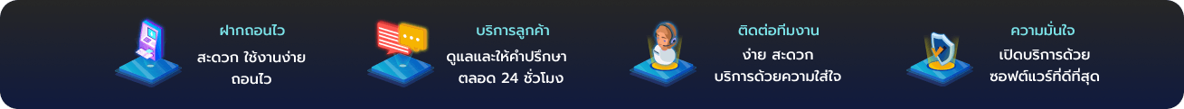 ตอบ : - มีระบบฝาก-ถอนอัตโนมัติตลอด 24 ชั่วโมง รองรับธนาคารหลักทุกแห่ง ทำรายการภายใน 30 วินาที มีความปลอดภัยสูงด้วยเทคโนโลยีเข้ารหัส